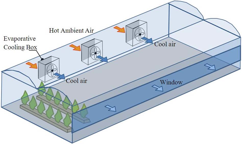 În loc să răcească aerul din interiorul unei sere, un sistem de răcire prin evaporare aspiră aer proaspăt din exterior și apoi îl distribuie în interiorul serei. Se produce astfel o racire si umidificare a aerului.
