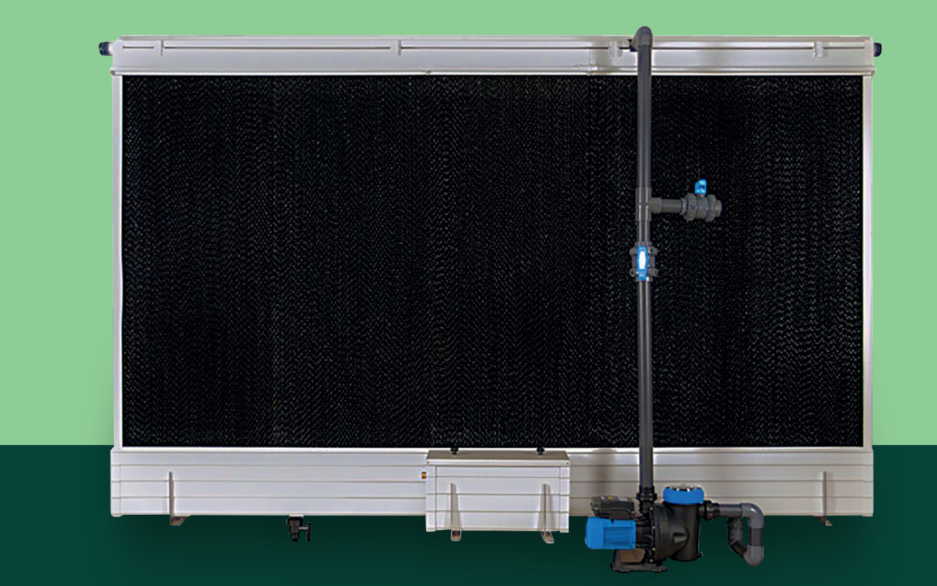 Sistemul de răcire prin evaporare al Ecogreen utilizează o tehnică cu ventilator și pernă.